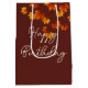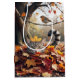Ett nyfiket tabby katt går ut från en hög av fallande höst löv, med en stöld som genomborras på ett närliggande gren. Text kan redigeras.
