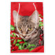 Den gulliga unga tabbykattungen har funnit julpyntet och leker med dem och att ha underbar roligt, i att göra så, kattälskarejul, helgdag somgåvan hänger lös