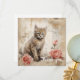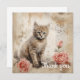 En flytande tabb med kattunge med Streckande blå ögon är sitta bredvid två rosa ros mot en bakgrund med vintage och bläck-block. Sepian tonar ge en varm antik känsla för sammansättningen, som kombinerar blommigtar och ett sött djur subjekt.