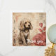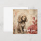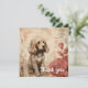 En guldbrun marionett med fluffy päls ligger sitta nära ett par stora, stiliserade ro. Bakgrunden har abstrakt-beige-toner med subtila blommigtar och skriptliknande markeringar, ge en mjuk vintage-känsla för hela sammansättningen.
