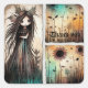 Ett helt ritat tecken med stort ögon och långt hår med blommor står bredvid två fyrkantiga bilder av stiliserade blommor i fält. Paletten i färg är varm med sepia, turkos och bränd orange som dominerar scenen, vilket framkallar en nostalgisk känsla eller en känsla av vintage.