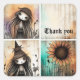 Fyra fyrkantiga paneler kombineras för att visa en stiliserad, visuell scen. Två paneler innehåller stora, vita tecken med flytande hår och hattar, medan de intilliggande panelerna är adorerade med eterisk flora och fet solros.
