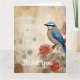 En levande blå och vit fågel är elegant i ett kluster av koral ro med sina fjädrar detaljerade och vassa mot blomningen. Bakom fågeln och blommorna tillfogar den blekta musikaliska noteringen en vintage i bakgrunden och framkallar en känsla av nostalgi.
