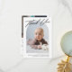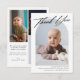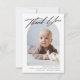 Tack för ditt kort, det moderna minimala födelsetalet i Baby. Utformning med ett tack för ditt skript, ett foto av baby på framsidan, födelsestatus, datum och ett namn på framsidan och tre foton på baksidan.
