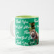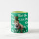 Tack Bästa Kattmamma Söt katt med Leprechaunhatt, generativt innehåll på din kaffemugg. Katten kommer fram från den gröna bakgrunden med hälsningar och håller tassarna på shamrocks. Insidan av muggen är grön limefärgad. Du kan ändra kattens foto och namn med din egen katts genom att använda alternativet Ta bort bakgrund för fotot och behålla resten av bilderna, om det behövs kan du justera hatten på din katts huvud. En fin irländsk muggpresent för kattälskare.