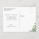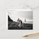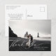 Elegant vit "Tack"-kalligrafi på bröllopsfoto tack-kort. Kortets baksida visar en akvarelldekoration med skogslövverk.