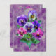 Färgrik akvarellbukett av viol och penséblommor på en lilafärgad akvarellbakgrund och inskriften TACK på baksidan.