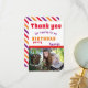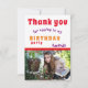 Tack födelsedagskort med fotografering. Du kan anpassa det med ditt foto och ditt namn. På baksidan finns färgglada ränder. Tacka alla för att de kom till din födelsedagsfest
