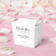 "Tack för att dela den här dagen med oss" skriven på topp. Anpassa under med namn och bröllop-datumet och en olivsprit vid grund. Fyll i lådan med godis, behandlar eller till och med lämnar ut den för ditt ljus bord eller lämnar station!