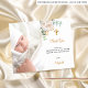 Ett modernt och elegantens baptism tack vare ditt kort. En chic vit bakgrund som dekoreras med en vattenfärgad vit blomma, peony, eucalyptus greenery och faux guld löv. Anpassa och lägg till ditt foto av barnet, tackkortet och namn. Tillbaka: Medieikoner i social, din egen fyrkantiga kod till ditt Instagram-konto eller din webbplats så att dina gäster kan titta på fler foton. Det här kortet finns också i vår butik utan medieikoner i social.