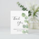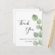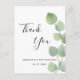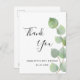 Ett tack för en 50-årsdag (eller vilken ålder som helst). En chic vit bakgrund som dekorerats med eukalyptus greenery. På framsidan skriver stora svarta färgader skript och text: Tack, text, rubrik och datum. Tillbaka: Anpassa och lägg till tackkort och namn.