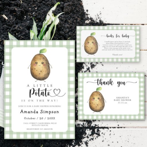 "Tack". "En liten potatis är på väg." Fira med den här tecknaden potatisen, den så kallade babyduschen party! Vattenfärgad söt potatis med baby ansikte. Gröntens bur.