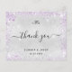 Ett tackkort från bröllop. En faux silver metallisk tittar bakgrund färg. Med lila Faux glitter stoft. På framsidan, ett stort handskript och texten: Tack, ditt monogram initialer, namn och ett datum. Tillbaka: Anpassa och lägg till foto, tackkort och namn i bröllop.