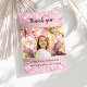 Ett Tack för att bekräfta att en tjej är fotograferad. En dammig rosa bakgrund, svart text. Dekorerad med rosa CONetti. Anpassa och lägg till ett foto och tackkort.