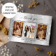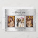 Lägg till 3 av dina födelsedagsfoton, lodrät storlekt, ett datum, namn och tackkortet. En faux silver tittar bakgrund och faux glitter, gnistor. Svart text och ram. Texten: Tack på framsidan och ditt namn på baksidan skrivs med ett handskript med snyggt.