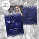En ojämnt blå färgad, dekorerad med faux silver konetti. Inuti: 1:a av dina foton, lodrät storlekt. Ditt tackkort. Tillbaka: Andra av dina foton, landskap storlekt.