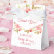 Med contemporaryns rosa, persiko- och korallblommor i vattenfärgad färgad av dahlia. Eleganten vit som bakgrund. Mallar för mamma till namn och datum. Coral färgad brev. För en flicka. Med texten: Tack! och Babyskaren