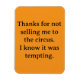 Tack för att du inte sålde mig till cirkusen. Jag vet att det var ett frestande kort