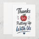 En rolig och relaterbar lärare uppskattning design med “Tack för att du står ut med oss”. Detta lättsamma budskap speglar den vardagliga klassrumserfarenheten på ett humoristiskt och ärligt sätt. Perfekt för studenter som vill säga tack med ett leende, skapar denna design en minnesvärd och engagerande present.
