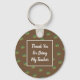 Tack för allt de gör, vare sig det är under helgdagarna, i slutet av året eller bara för att. Grönt och brunt löv ger bakgrunden till denna tacknyckelkedja. Löven står mot en mörk brun bakgrund som kan anpassas efter kostym dina behov. Nyckelkedjans mittpunkt har en solid brun kvadrat som stöder orden av uppskattning. "Tack för att du är min lärare" kan enkelt anpassas efter dina behov i kostym.