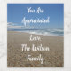 Märkningen vin flaska är ett foto på en strand som är övergiven. Den långvariga utbyggnaden av bruna sandsluttningar mot blått Stilla havet vinkar. Ett ljust blå himmel med ett puffigt vitt moln ger bakgrunden till "Du är uppskattad" och namn i din familj, som visas med vitt teckensnitt. Om du vill kan du enkelt anpassa all text.