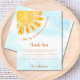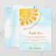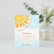 Denna tackkort för baby shower har texten "En liten solstråle är snart här!" med en gul akvarell sol och en blå himmel som bakgrund.