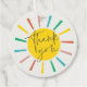 En Bright Sun Script-tackmärketikett för barnkalas med regnbågssol och modern text tack på framsidan. Baksidan har ett tackmeddelande från födelsedagsbarnet. Klicka på redigeringsknappen för att anpassa designen med dina detaljer.
