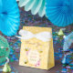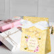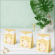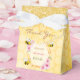 En favoritlåda för en sommarbröllopsfest. En gul bakgrund med ett bikakemönster. Med en falsk geometrisk ram i guld och falska glitterdropar i guld. Dekorerad med rosa tropiska blommor, hibiskus och glada humlor. Med texten: Tack och Brud att bli skriven med en modern handskriven stilsnacka. Mall för den blivande brudens namn och datum för festen. Rosa, gröna och bruna bokstäver.