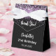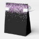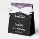 En elegant och glamorös födelsedag, vilken ålder som helst. En svart bakgrund med lila faux glitter, gnistor. Med texten: Tack! Anpassa och lägg till din namnålder och ett datum. Vit brev. Namn är skrivet med ett handskript i trendiget stil.