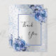 Faux silver tittar bakgrund, dekorerad med ljusblå faux glitter, gnistor och blå blommigtar.På framsidan med stora bokstäver och texten: Tack. Tillbaka: Anpassa och lägg till tackkort och namn.