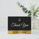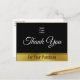 På framsidan står "Tack" i mitten av vykortet som ett vitt skript i eleganten. I grund finns det svart visning som du kan redigera (Visa: För ditt inköp). Den svarta texten finns på guld rand. Överst finns det en visning som kan ersättas med företagets logotyp. På baksidan finns visning för returadressen och linjer för mottagarens adress. All text kan redigeras eller tas bort. Faux guld är en konstnärlig återgivning (dvs. inte folie). Det här vykortet har inga minimala värden.
