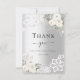 En modern och elegant babydusch tack vare ditt kort. En faux silver tittar bakgrund. Dekorerad med vit ros, blommigtar och snöre. Längst fram texten: Bakåt: Mall för tackkort och namn.