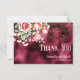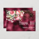 Ett tackkort från elegant bröllop som innehåller rosa ros på en fingerad burgundisk folie och guld glitter.
