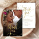 Modern Boho Chic Guld Calligraphy Script Photo Bröllop - tackkort. Snyggt bröllop tackar dig för att du har en fullt framsida med texten "Tack" i ett lodrät, snabbt och snävt bokstäver typografi, dekortecken svan, teckensnittsskript faux guld överlägg på bild. 2-sidiga kort med förinställt tackmeddelande på motsatt sida. Du kan enkelt anpassa ditt namn och tacka för ditt meddelande. Om du föredrar att skicka anteckningen tar du bara bort exempeltexten för att få mer utrymme. Kontakta mig om du behöver hjälp eller matcha objekt!