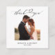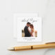 Uttryck din tacksamhet med det här budgetvänliga, enkla fotokortet, som innehåller elegantens svarta skript "Tack" med namn, bröllop datum och foto på framsidan. Den enkla vita bakgrunden skapar ett slimmat och modernt utseende. Anpassa baksidan med ett uppriktigt budskap för att tacka dina gäster.