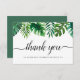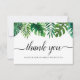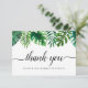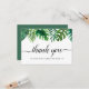 Tack vare det moderna tropiska bröllop-kortet har du en grönt monstera med vattenfärg och handflatan löv-illustration på en vit bakgrund. Inbjudans omvända sida finns i färg på djupt grönt.