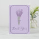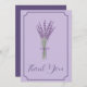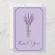 Bröllop tackar dig för ett platt kort med ett personlig-meddelande med ett par initialer på mörkens lila bakifrån och på ljusa, ljusa framsidan med vattenfärg, lavender blommor bouquet inuti ram