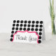 Ett tackkort med en bakgrund med stor svart polka dots över vitt. Texten i rosa ram vid grund står "Tack". Anpassa insidan.