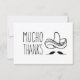 Mucho Tack! Den här söta 5 x 3,5 tum tacksamma ditt kort innehåller text som säger "Mucho Tack" med en chippsombrero och mustasch. Baksidan lämnas tom så att den kan skrivas på.