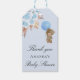 För en elegant och modern babydusch. En ljusblå bakgrund. Dekoreras med ljusblå blommigtar, pampasgräs och en nalle pojke som håller ballong. Anpassa och lägg till ett namn. Med texten: Tack och Baby Shower skriven med en elegant hand och skript stil.