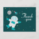 Den här söta pojkens födelsedagsfest tack för ditt postkort har ett världsomspännande rymdtema! Bakgrunden har en mörk färg med många gult-, vit- och grått-stjärnor i bakgrunden. Det finns en astronaut på den lämnat med grått måne med en stjärna i flagga överst. Det finns en raketfrakt som flyter till högerna av måne. På högerna är tack skrivet. På baksidan finns det utrymme för dig att lämna skriva i ditt tackmeddelande hemma.