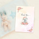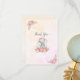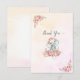 Trådlös elefant från flicka med blommor ovanför hennes öra och en andningsbesprutning under blommigten. Korall och rosa vattenfärgsbakgrund med blommigtens hörn. Tack på framsidan.