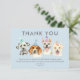 Söt tack-kort att skicka ut efter ditt barns valp-tema födelsedagsfest. Detta kort har redan text som du kan använda som det är eller redigera enkelt online. Illustration av 4 hundar (dalmatiner, beagle, pitbull-terrier) med födelsedagshattar med texten "tack" ovanför dem.