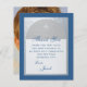 Ett blått första kommunalt tack för en pojke. På en klassisk blå rektangulär bakgrund har den en faux-silver-folie som har inuti blå text på vit bakgrund. Ord "Tack" och namn är skrivna i ett kalligrafiskt skript för elegant, resten i versaler. På baksidan finns ett platshållarfoto av en pojke, från Pixabay, som är datorgenererad (inte en riktig person) och fri från kommersiell använda.