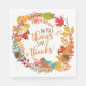 Den här Thanksgivingen kallas pappra servetter och skriver "In All Sak Ge Tack" i en söt höstandekrans. Utandningen är gjord av brunt, guld och löv, fröplantor och grenar, med en liten fågel vid grund.