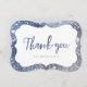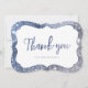 Faux gnistra silver och blå glitter bakgrund med "tack"-skript i mitten, elegant och snyggt, underbart tack för bröllop, födelsedagsfest, möhippa, babydusch eller andra specialtillfällen.