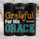 Det här är en grafisk design i biet som innehåller andlig-frasen "GRATEFUL FOR HIS GRACE" i ett teckensnitt med flera färger och med flera lager. Texten ställs in mot en enkel, lätt grått-bakgrund. Ord är tacksamt och återges i ett stort, texturerat orange med ett kor som är integrerat i designen. Orden "För hans" och "GRACE" står i kontrast till vitt och plågat teal typsnitt, åtskilt av dekorativt linjer. Den totala estetien är modern och trosbaserad och lämpar sig för en mängd inspirerande produkter.