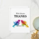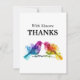 Tack-kortet frÄn Bröllop frÄn "Rainbow Lovebird Collection" Àr ett charmerande sÀtt att uttrycka tacksamhet till dina gÀster med dess fÀngslande utformning och pulserande elegans. Med 7 x 5 tum har det hÀr platta kortet en snygg teckning som inspirerats av den fÀrgstarka skönheten hos regnbÄge, vilket skapar en glatt bakgrund för ditt tackbudskap. PÄ kortets framsida visas texten "med uppriktiga tack" elegant mot bakgrund av vibrerande regnbÄge, vilket ger en kÀnsla av vÀrme och uppskattning. Den lekande charmen hos regnbÄgarna tillför designen en liten elegans, som anger tonen för ditt hjÀrtliga budskap. Om du gÄr till baksidan av kortet finns det gott om utrymme för ditt personlig-meddelande mot en pristinvit bakgrund. HÀr kan du uttrycka din tacksamhet med anpassadets text, vilket gör varje kort personligt berört. Ta med parets namn, datum och plats i bröllop för att göra meddelandet mer meningsfullt och minnesvÀrt för dina gÀster. Tack-kortet i Bröllop Àr ett tankevÀckande tillÀgg till "Rainbow Lovebird Collection", som erbjuder en rad samordnade stationeringsalternativ för att förbÀttra firande i bröllop. FrÄn inbjudningar att placera kort och mer kompletterar varje biet i denna samling temat vibrerande kÀrlek och delaktighet, vilket garanterar en sammanhÀngande och visuellt bedövande presentation för din speciella dag. Förbered bröllop glÀdje och skönhet med detta hjÀrtliga uttryck för tacksamhet.
