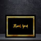 Ett tackkort för en jubileumsfödelsedag. En svart bakgrundsfärg och en falsk guldram. På framsidan en handskriven stilsnurr och texten: Tack!