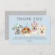 Sött tackkort att skicka ut efter ditt barns valptema-födelsedagsfest. Detta kort har redan text som du kan använda som det är eller redigera enkelt online. Illustration av 4 hundar (dalmatiner, beagle, pitbullterrier) med kalashattar med texten "tack" ovanför dem.